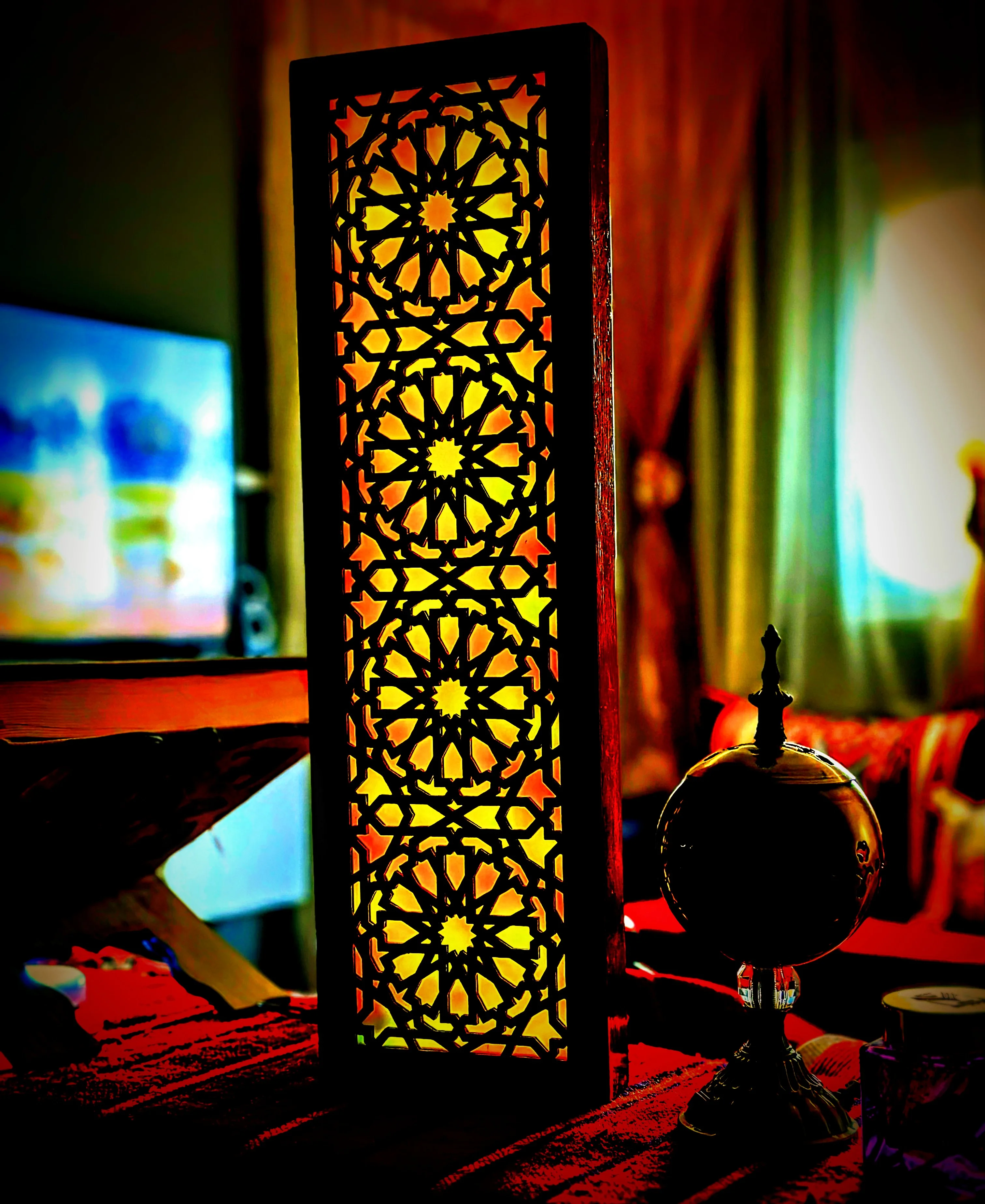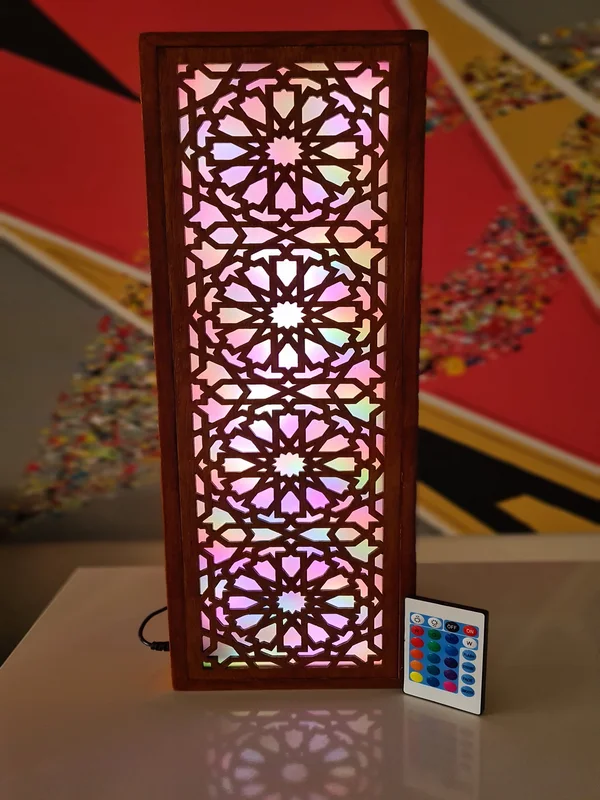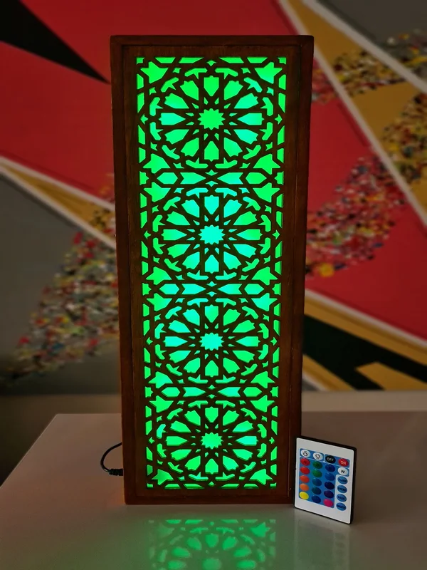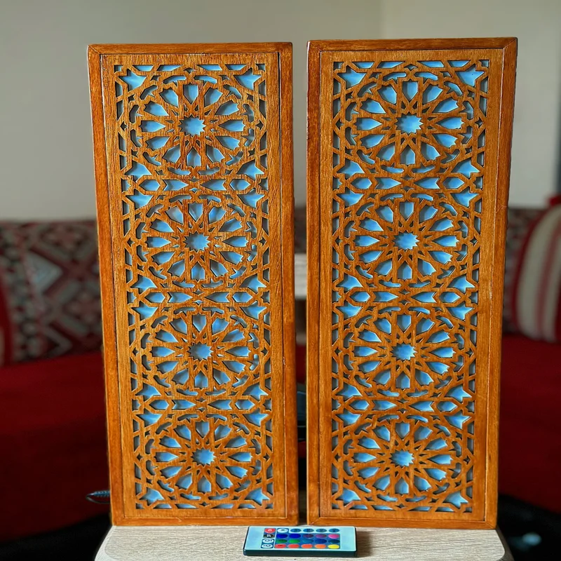 باك ديكور خشبي مقطوع بالليزر متغير الألوان RGB بجهاز تحكم عن بعد، أساس الطراز المغربي التقليدي المعاصر، مصنوع يدويا من خشب عالي الجودة + توصيل مجاني لحد باب البيت والدفع عند الإستلام.